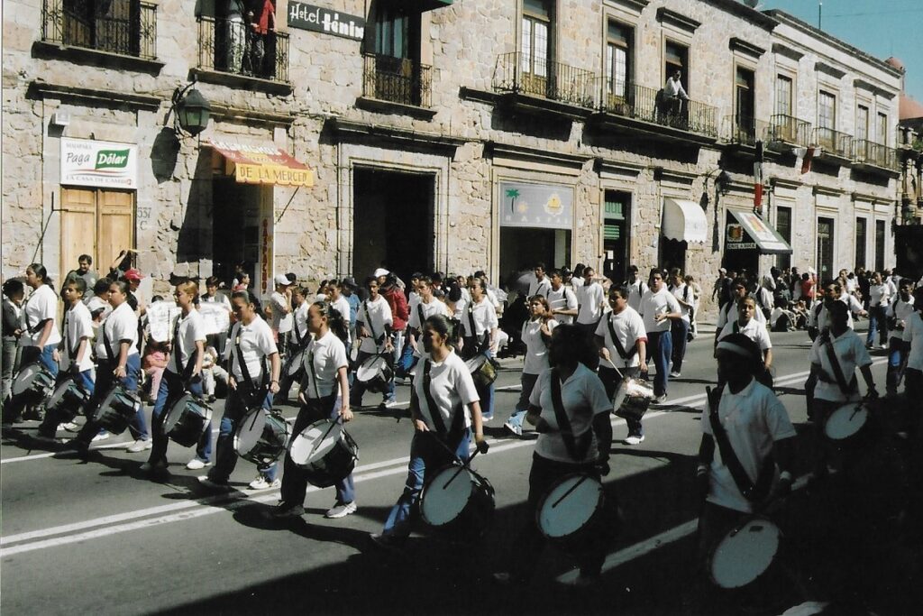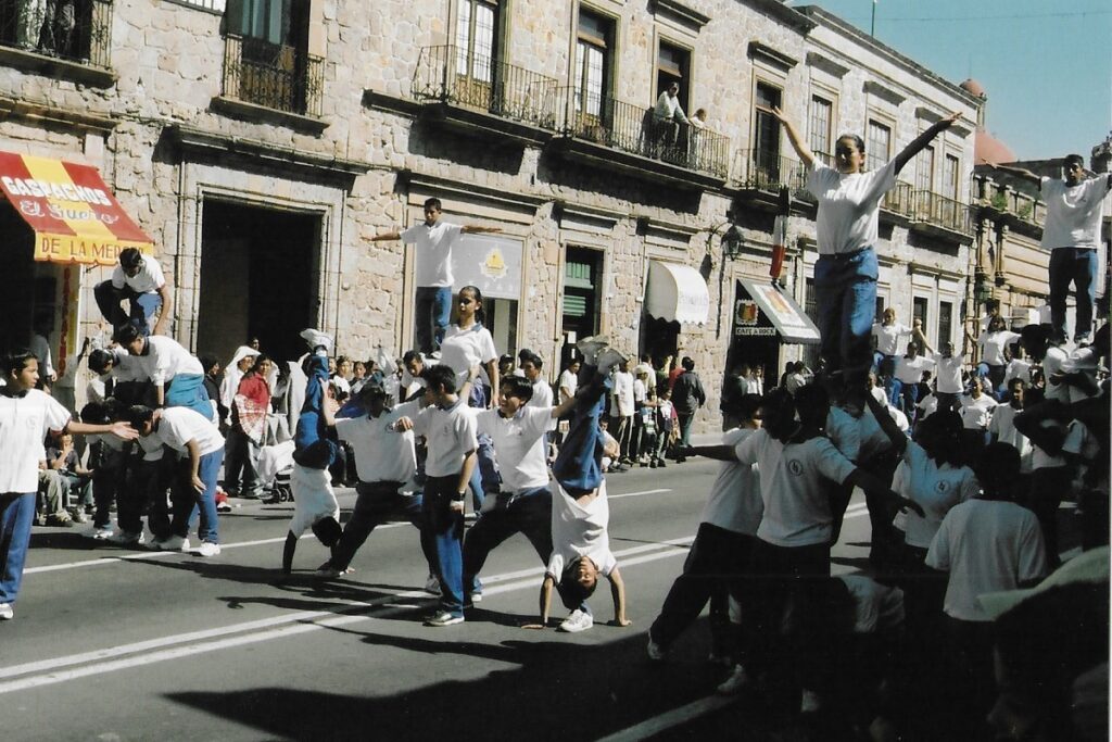 Behind this vehicle walked thirty drummers. At intervals they would break into the choreographed movement that I had seen enacted down the side of the Cathedral the previous night. The drummers were followed by bugle players from another local society. In fact far from any jingoistic commemoration of the Revolution – (which Mexican revolution would have been difficult to define. There have been so many). The morning’s events constituted a massive coming together of a diverse range of community groups. Not just a procession representing all their separate interests, but an effort to integrate them as well. And so behind the bugle players were the gymnasts, who formed a three-tier pyramid. The second tier of them stood on the shoulders of the first. And then at the apex, forming the third tier were balanced two bugle players, who had been borrowed from the legion in front.