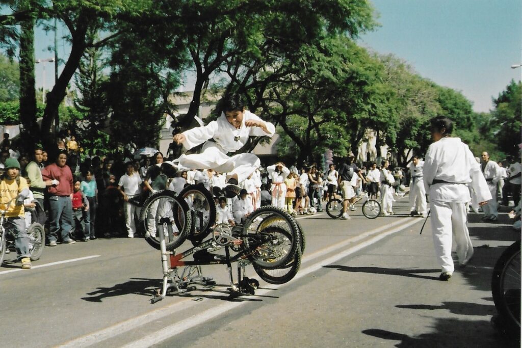Local cycling clubs crawled past, just about retaining their balance on two wheels. But then another example of a seamless transition between the community groups on display. Behind the cyclists were several judo clubs. Three of the cyclists dismounted. And posited the bicycles sideways and parallel to each other. Members of the judo club then took it in turn to perform stretching vaults over the bicycles.